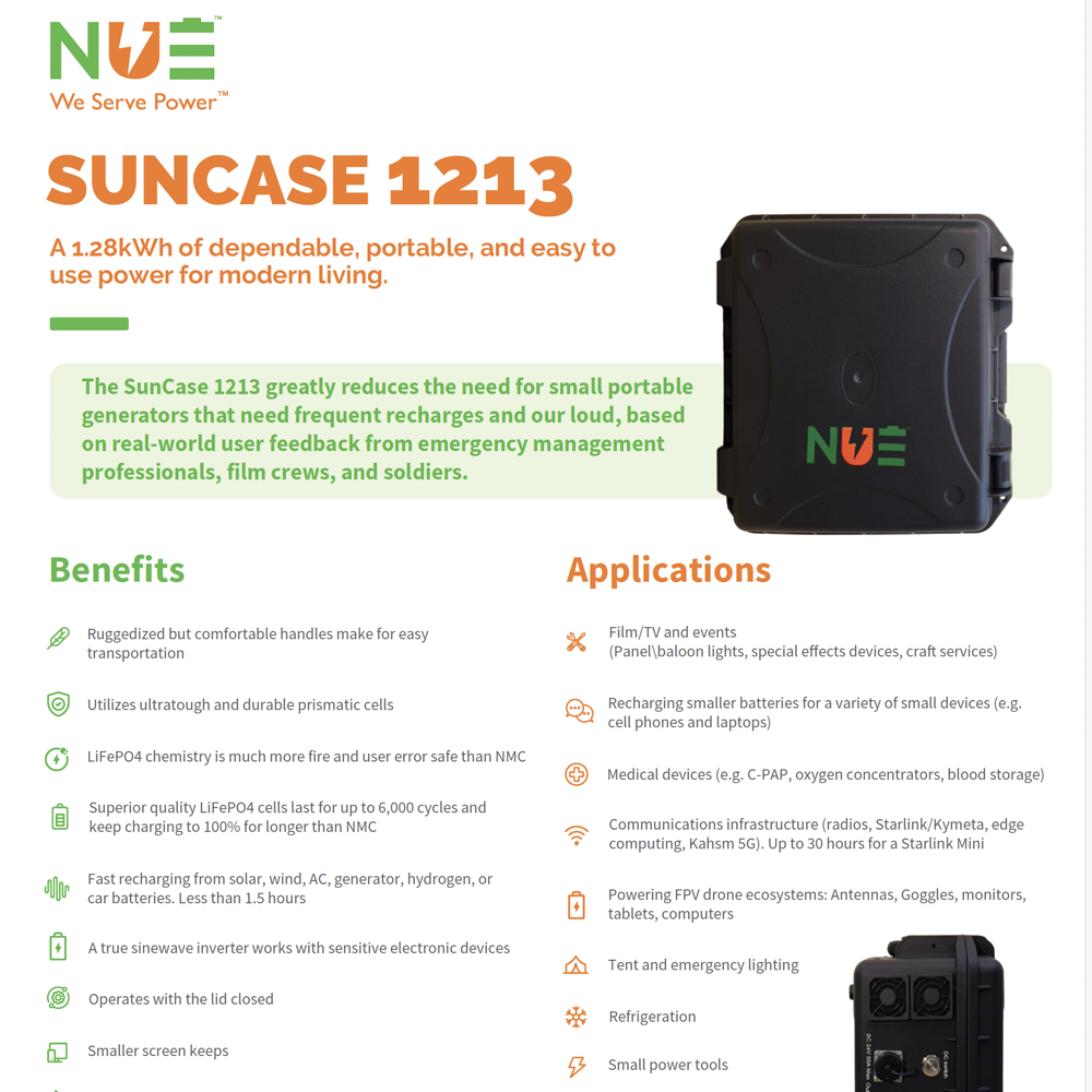 The Generator is Dead. Long Live the SunCase™. We didn’t just build a battery in a lab; we built the SunCase™ 1213 based on what people actually asked for in the field. We listened to soldiers, emergency management pros, and film crews who were tired of hauling around loud, fume-heavy generators that needed constant refueling. The result? A 1.28kWh power station that is silent, reliable, and tough enough for the real world. Whether you are running a remote film set, keeping a C-PAP machine humming through a blackout, or keeping a Starlink online in the middle of nowhere, the SunCase™ 1213 just works.